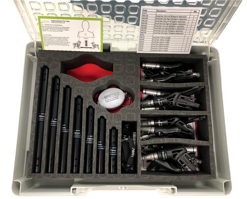Bar and Clip Boxes organise a complete stock of ADM Modular System Bar and Clip components making it easy to assemble a fully configured External Rotation Bar to your patient’s requirements in just a few seconds.  Sizing Liner sets are the best and fastest way of determining which size orthosis is required for your patient.